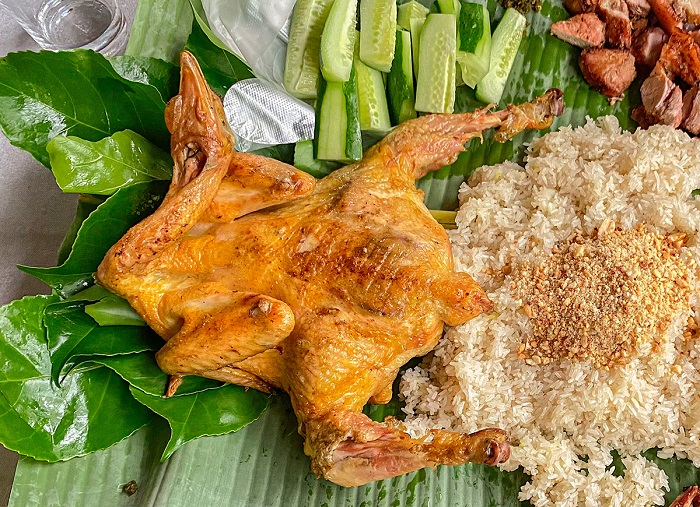 Gà nướng vàng ươm được tẩm ướp gia vị riêng biệt của miền Trung, ăn kèm với xôi cùng muối cheo đặc sản đã tạo nên một món ăn truyền thống vô cùng hấp dẫn.