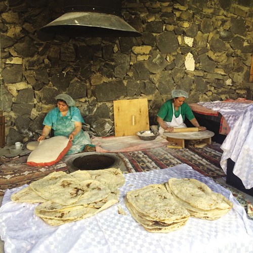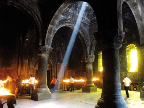 Rời đền Garni, lái xe thêm 9km dọc theo hẻm sông Arat về phía đông, chúng tôi đến Tu viện Geghard – có nghĩa là tu viện hình mũi giáo. Xe cộ phải dừng lại bên ngoài rất xa và phải cuốc bộ trên một con đường lát đá gồ ghề để vào cổng chính. Hai bên đường đi là những quầy hàng lưu niệm cùng đặc sản của Armenia là bánh mì gata tròn dẹt to như cái mâm và lavash – một loại bánh tráng làm từ trái cây phơi khô có vị chua ngọt mà ai đến đây một lần đều muốn ăn thử cho biết. Gần lối vào có một hốc đá tương truyền là hố thiêng, nếu ai ném lọt hòn đá vào đấy thì ước gì được nấy. Khi chúng tôi đến đây đang có nhiều người ném những hòn đá vào hố để thử vận may.