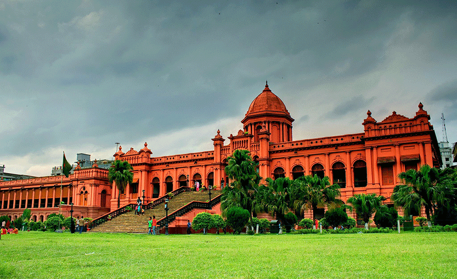 Di sản Ahsan Manzil- Nằm cạnh bờ sông Buriganga, di sản Ahsan Manzil được xây dựng từ năm 1872 và là công trình có kiến trúc ý nghĩa nhất của Bangladesh nói về phong cách sống của người Nawabs. Công trình này còn có tên gọi khác là cung điện Hồng.