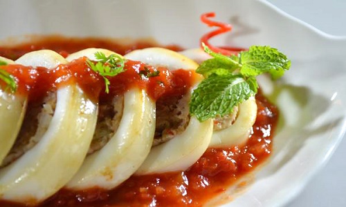 - Mực nhồi thịt: Mực được rủa sạch, ướp gia vị, nhồi hỗn hợp thịt xay nhuyễn kèm những gia vị đặc trưng rồi nướng lên. Đây là món ăn gắn liền với vùng đất biển mặn mà
