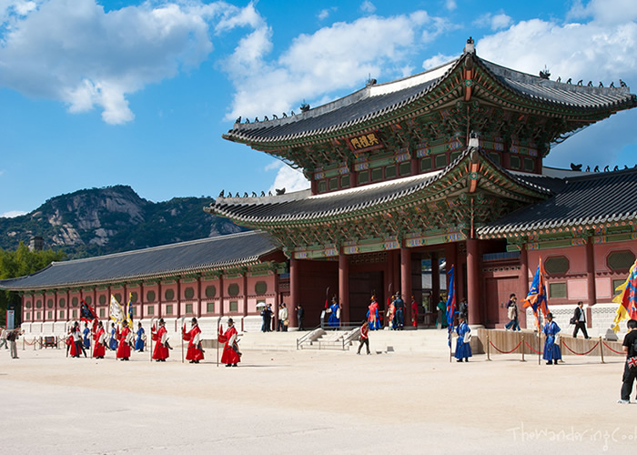 - Cung điện hoàng gia Kyong-bok: Là cung điện Hoàng gia đầu tiên được xây dựng trong triều đại Joseon (triều đại phong kiến cuối cùng của Triều Tiên). Cung điện Kyung-bok được xây dựng dưới sự chỉ đạo của Kiến Trúc Sư Jeong Dojeon vào năm 1395, ba năm sau khi triều đại Joseon được thành lập, tọa lạc ở vị trí trung tâm của thủ đô Seoul (khi đó được gọi là Hán Dương (Hanyang), có phong thủy giống như Hoàng cung ở Trung Hoa: lưng dựa vào núi, mặt nhìn ra biển.