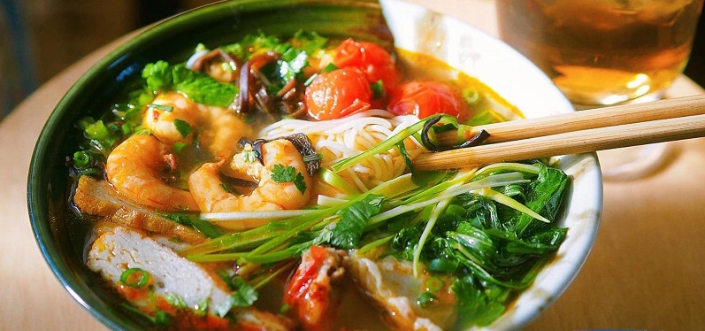 Bún tôm làm hài lòng những du khách kén ăn bởi vị thanh của nước dùng, vị thơm của tôm biển tươi, chả cá, không thể thiếu mùi lá trầu không. Đặc biệt, vị của nước me chua hoàn toàn có thể thay thế cho vị giấm và chanh. Hủ tiêu ăn được kèm với ít rau sống và một ít ớt khi ăn. Một bát bún tôm hải sản nóng hổi sẽ giúp bạn xua tan đi cái lạnh mùa đông tại Cát Bà.