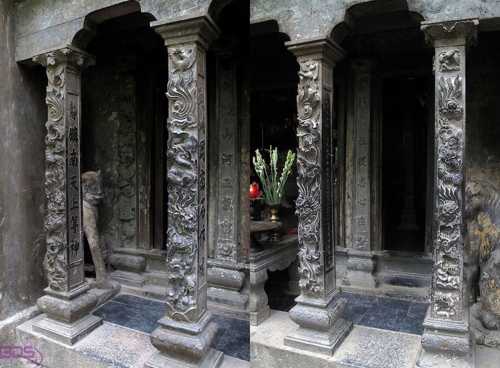 Bốn cột trụ được điêu khắc tỉ mỉ mô phỏng Long, Lân, Quy, Phụng.