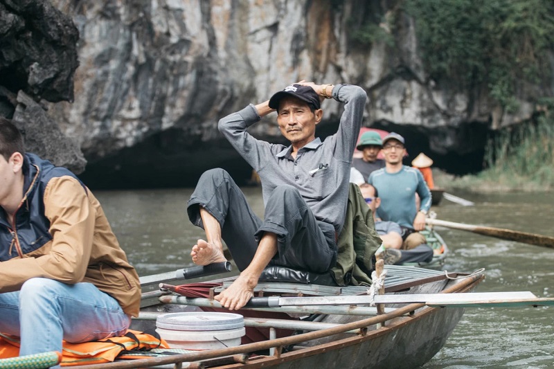 Tham quan Tam Cốc và Tràng An trên thuyền được lái điêu luyện bằng chân.