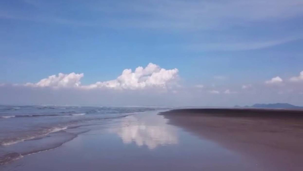 Bãi biển Kim Sơn dài 18km với mặt nước phẳng lặng phảng chiếu áng mây trên trời