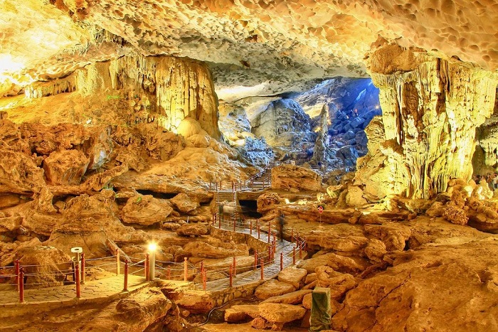 Đầu tiên phải kể đến là hang Sửng Sốt - hang động nổi tiếng bậc nhất ở vịnh Hạ Long. Tiến vào bên trong hang Sửng Sốt, đi lên 100 bậc đá là du khách sẽ được chiêm ngưỡng cảnh sắc thần tiên với những nhũ đá hình thù kỳ lạ, lung linh sắc màu. Tiếp tục di chuyển vào phần sâu nhất của hang, du khách sẽ thấy một hồ nước trong vắt cùng hệ động thực vật đa dạng, mà người ta thường gọi là “vườn thượng uyển”.