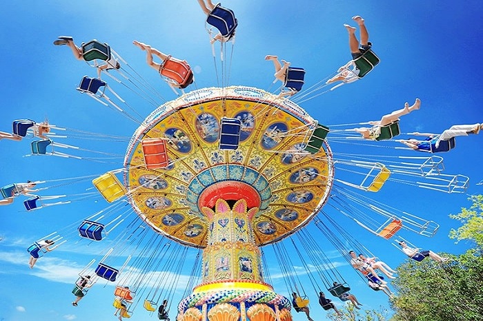 Tới đây, du khách có thể thử sức mình với các trò chơi cảm giác mạnh như: đu quay dây văng, đua quay lộn đầu, tàu lượn siêu tốc,...Thỏa sức mình với những trò chơi trong nhà hay những bộ phim 4D đầy ấn tượng.