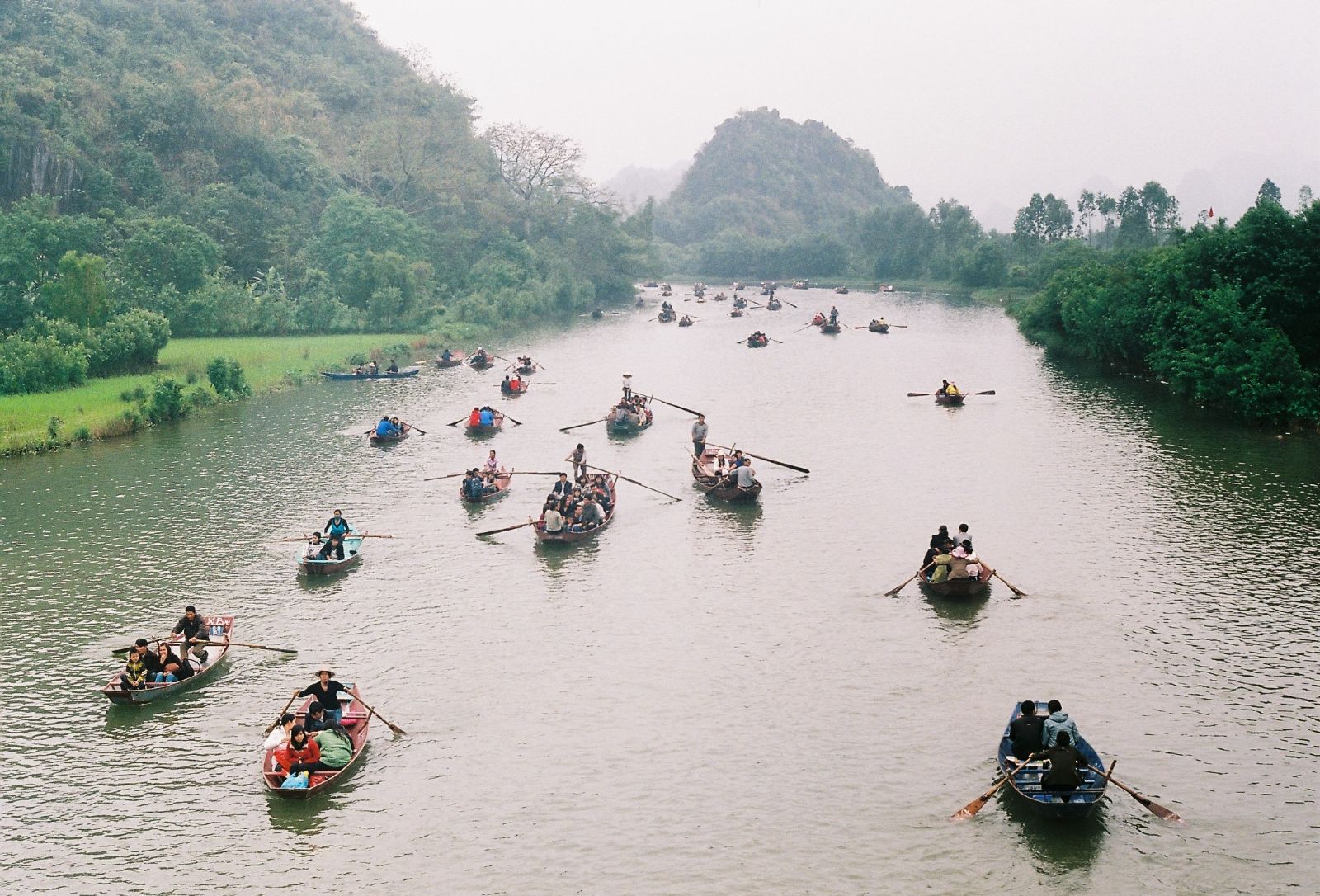 07h00: Xe và hướng dẫn viên của công ty đón quý khách tại điểm hẹn khởi hành đi du lịch Chùa Hương.